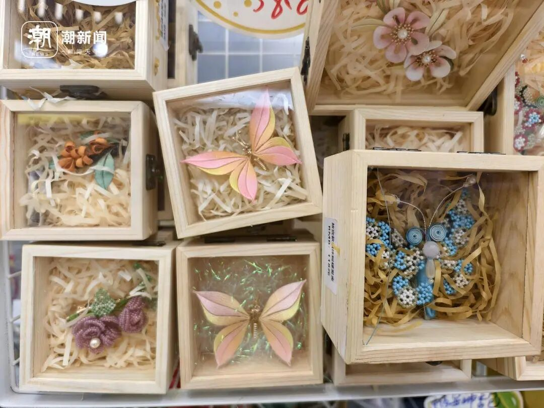 “这是蝴蝶绒花,戴在头上翅膀会飞,像真的蝴蝶停在上面。”小雨正举着一个粉色的蝴蝶绒花向客人介绍。她扎着妥当的马尾,眼睛亮闪闪的,说话间偶尔会顿一下,却全程仔细地注视着对方。